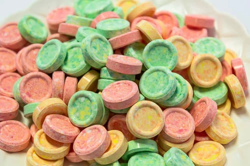 Ingredients – sugar, glucose syrup-wheat, tapioca starch, bicarbonated sodium, stabiliser – 1401, maltodextrin, flavour, colours – 122, 123, 124. CONTAINS WHEAT. made by Dollar Sweets Australia